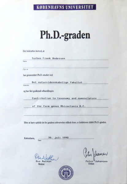 - PhD i biologi fra Københavns Universitet (1990)