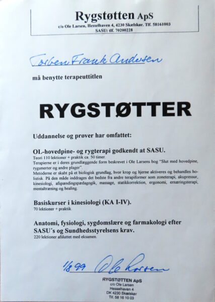 Jeg har altid haft en stor interesse for komplementær behandling. Da jeg første gang stødte på Ole Larsens uddannelse til Rygstøtter, stod det hurtigt klart, at der var et stort potentiale i metoden. Siden da har jeg arbejdet målrettet med at udvikle og videreudbygge behandlingsformen.