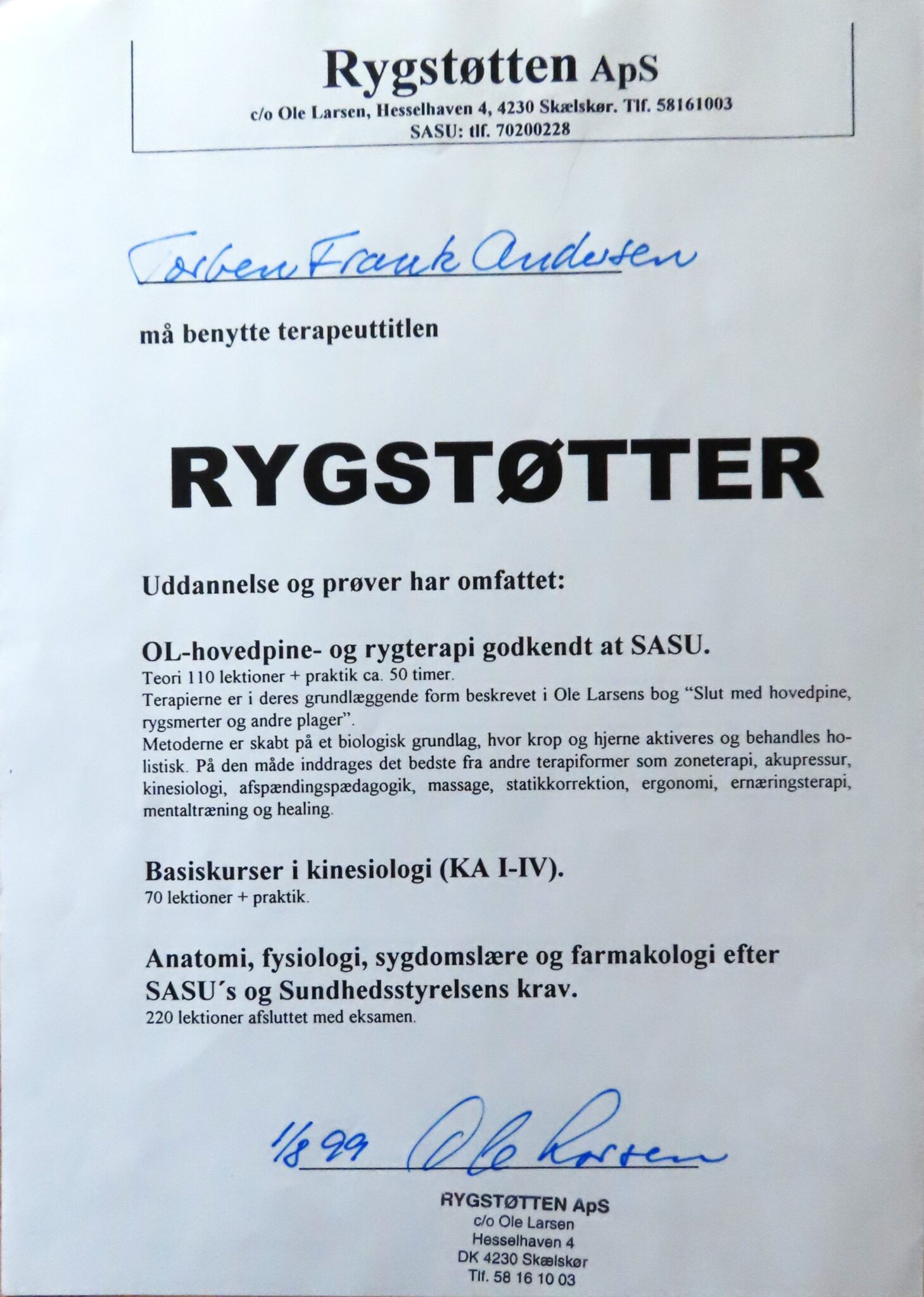 - Uddannet ALFA-kinesiolog ved Ole Larsen (1999)