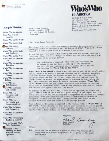 - Optaget i Marquis Who’s Who in the World (1997)